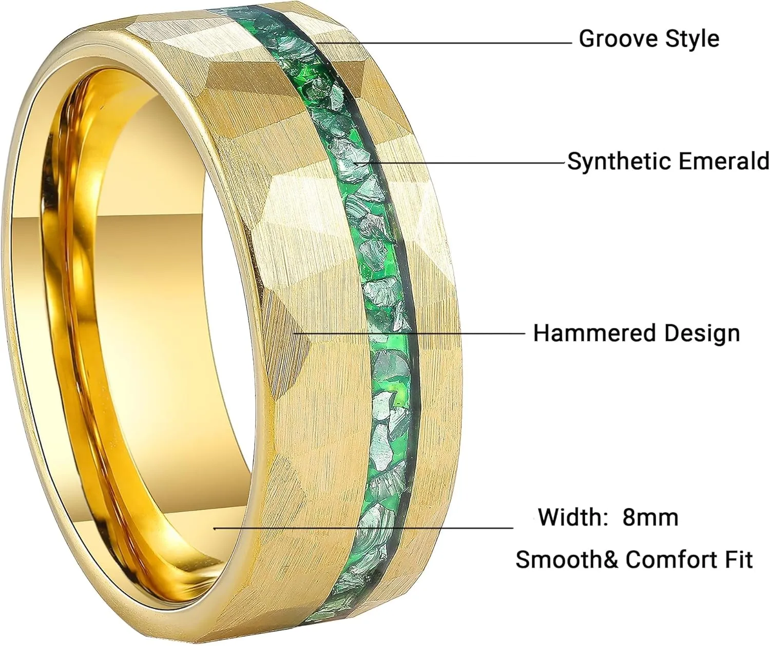 8mm Hammered Tungsten Rings for Men 14K Yellow/White Gold Men's Tungsten Wedding Bands Emerald/Meteorite Chips Inlay Matte Brush Comfort Fit Size 7-14