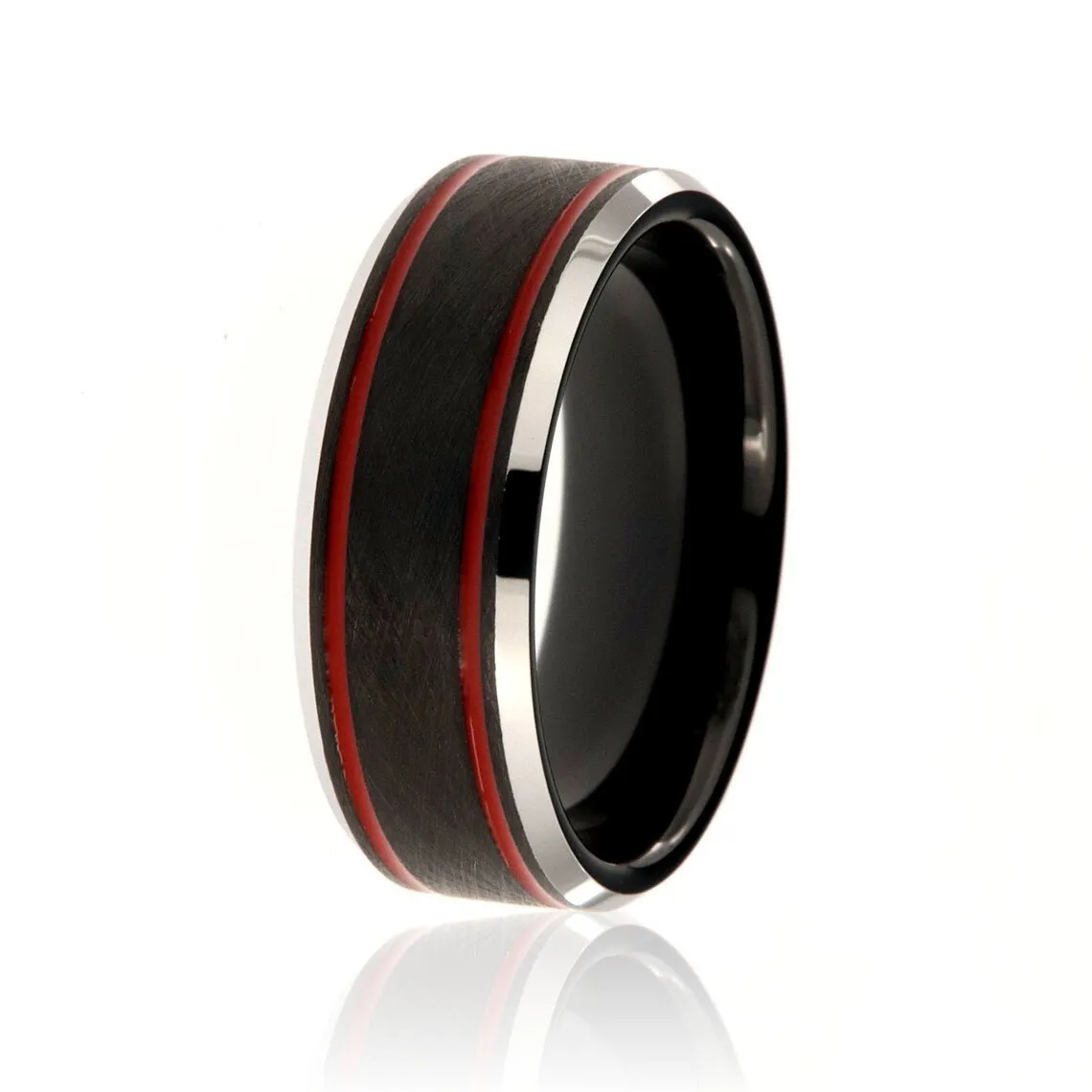 Step into unparalleled sophistication with our custom 8mm , meticulously crafted from robust Tungsten Carbide. The high-polished beveled edges add a touch of sleekness, while the mixed brushed finish with double red grooves creates a bold and distinctive statement. Engineered for enduring comfort, its comfort fit ensures seamless wear, making it a perfect choice for showcasing refined taste and timeless commitment.
