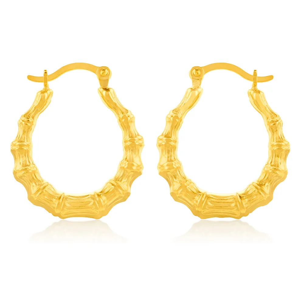 Add a contemporary twist to a traditional hoop with these 9ct Yellow Gold Silverfilled Fancy Light Hoop Earrings. Crafted in quality 9ct yellow gold that give the piece a tone of luxury, these earrings are the finishing touch to your gold look. The hoops have a fancy pattern that looks amazing worn on their own or paired with other gold pieces. The clasp is a latch back which is comfortable for all day wearing.