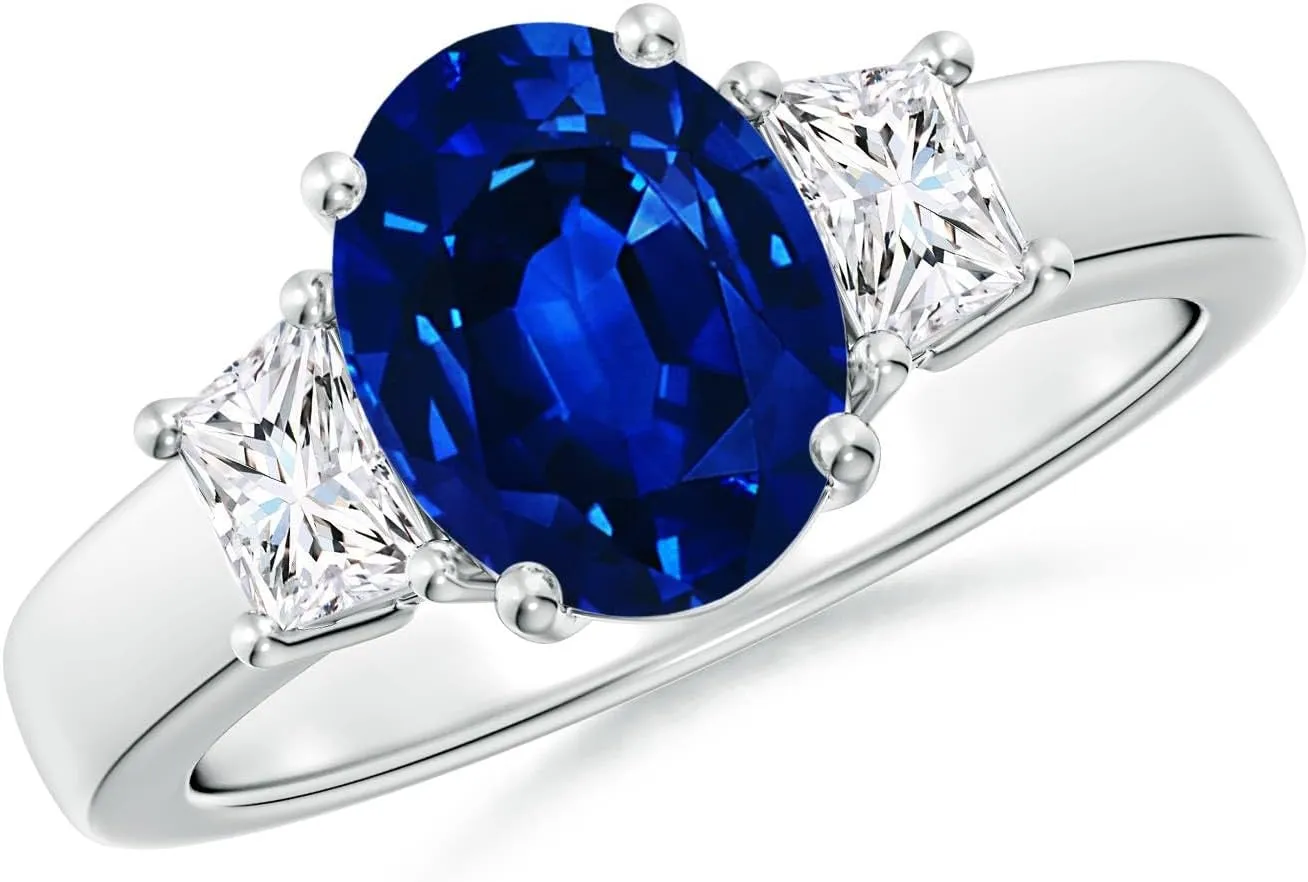 - : Symbolizing the past, present and future of a relationship, this blue sapphire three-stone ring is the perfect gift for your partner. Romantic and meaningful, it's exactly what you need to make her smile. Whether you're celebrating a milestone or simply treating her, this platinum three-stone ring will surely add a touch of magic to your special moment. Features 3.3 ct Lab Grown Blue Sapphire and 0.48 ct Lab Grown Diamond. Crafted in Platinum.