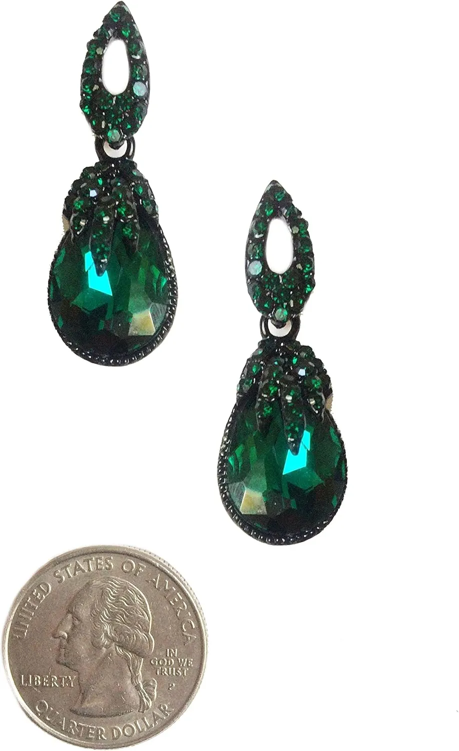 - Art Deco Retro Vintage Style Dark Emerald Green Pear Formal Wedding Bridal Prom Rhinestone Earrings