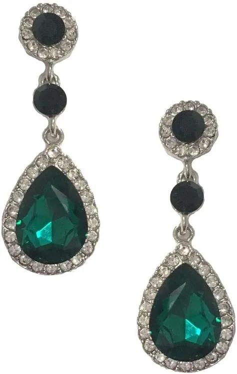- Deco Retro Vintage Style Hunter Emerald Dark Green Halo Pear Formal Wedding Bridal Prom Rhinestone Earrings