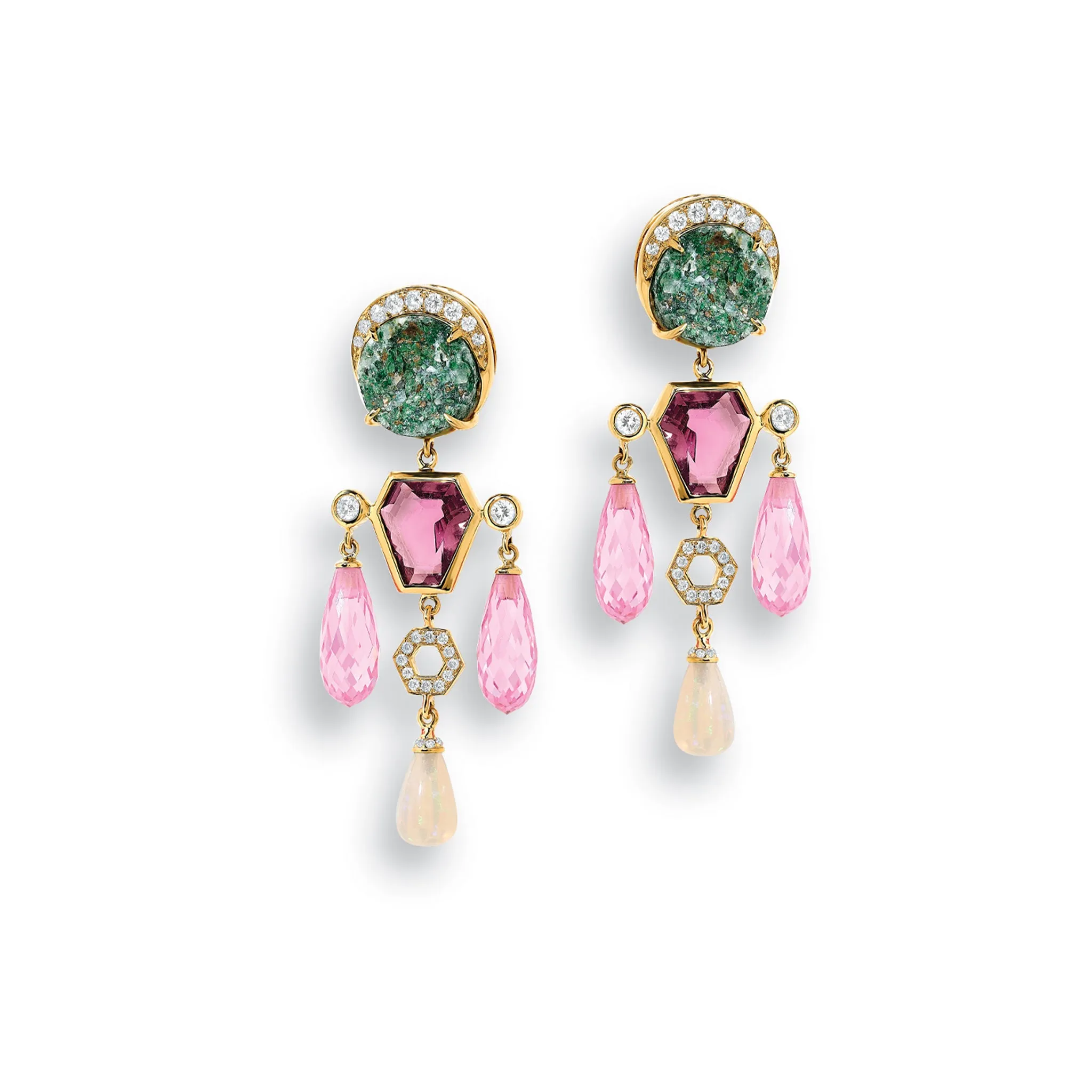 The Flower Crown earrings in 18ct yellow gold with Norwegian fuchsite, Brazilian watermelon tourmalines, Ethiopian opals, pink zirconia and diamonds is inspired by Frida Kahlo's fondness for hair ornaments and Cassandra's love of exotic flowers. From the journey to Mexico.