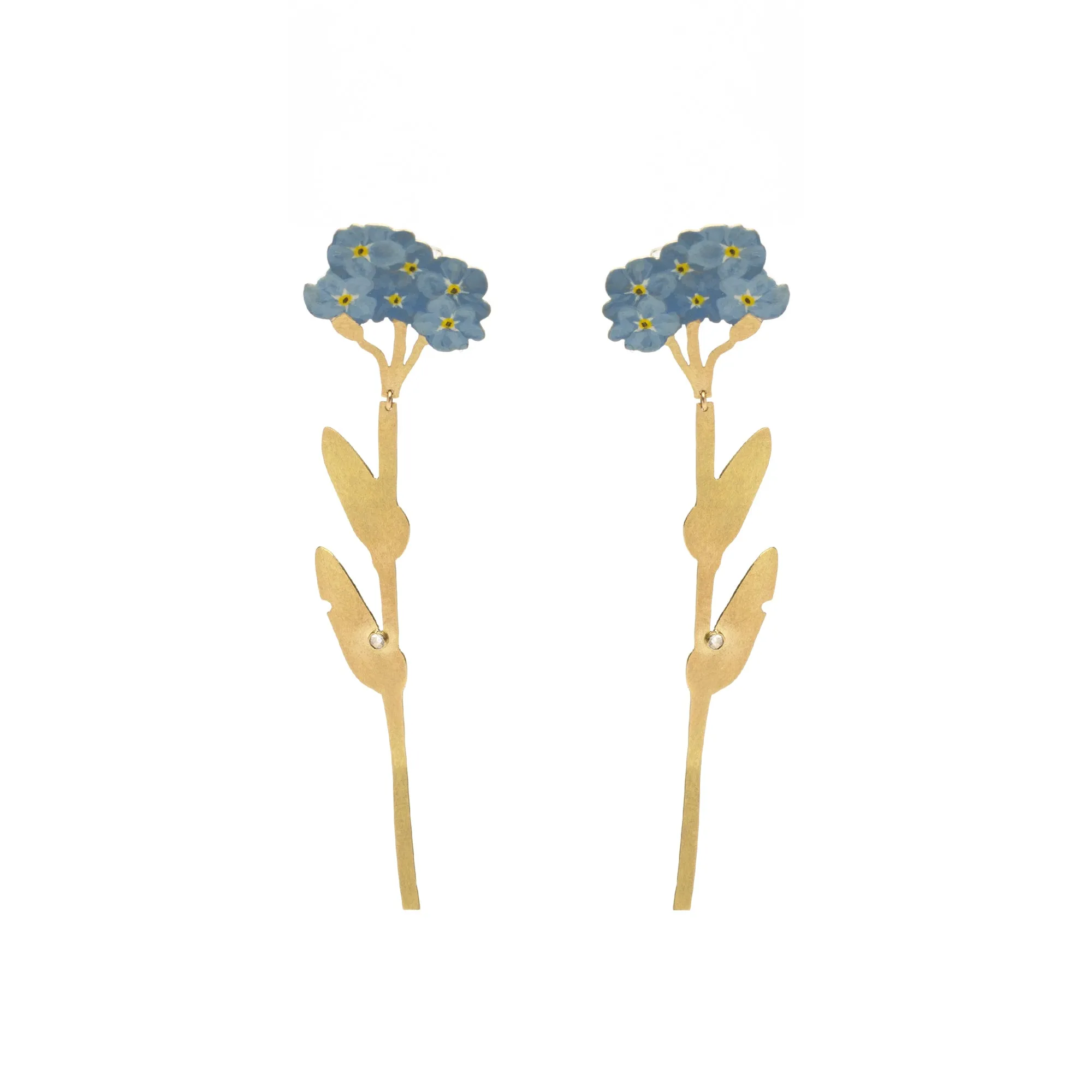 The hand painted 'Forget Me Not Drop Earrings' are crafted in 18K gold and diamond.