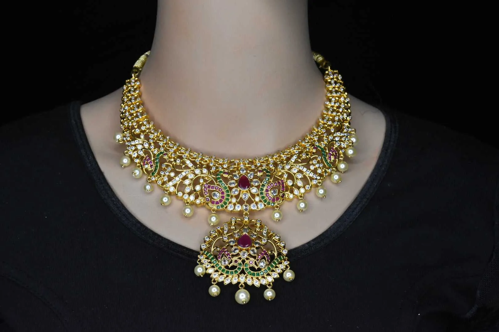 Graceful Premium Gold Plated CZ Ruby Peacock Necklace is studded with high-quality shining CZ's and Ruby Stones. Peacock design pendant with dangler and the semi-precious stones paving gives the necklace an elegant look. Perfect for Marriage, engagements and Party and it is an excellent gift for women on special occasions.