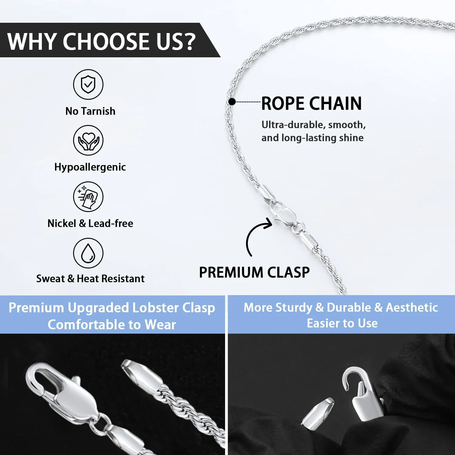 - Premium Quality Silver ChainThe silver chain is made with high-quality stainless steel material which is Hypoallergenic, Nickel-free, and Lead-free, so you can feel confident wearing this necklace chain every day. Extraordinary craftsmanship gives the chain a smooth and flowing surface that fits comfortably around your neck without worrying about hair tangling or getting caught.