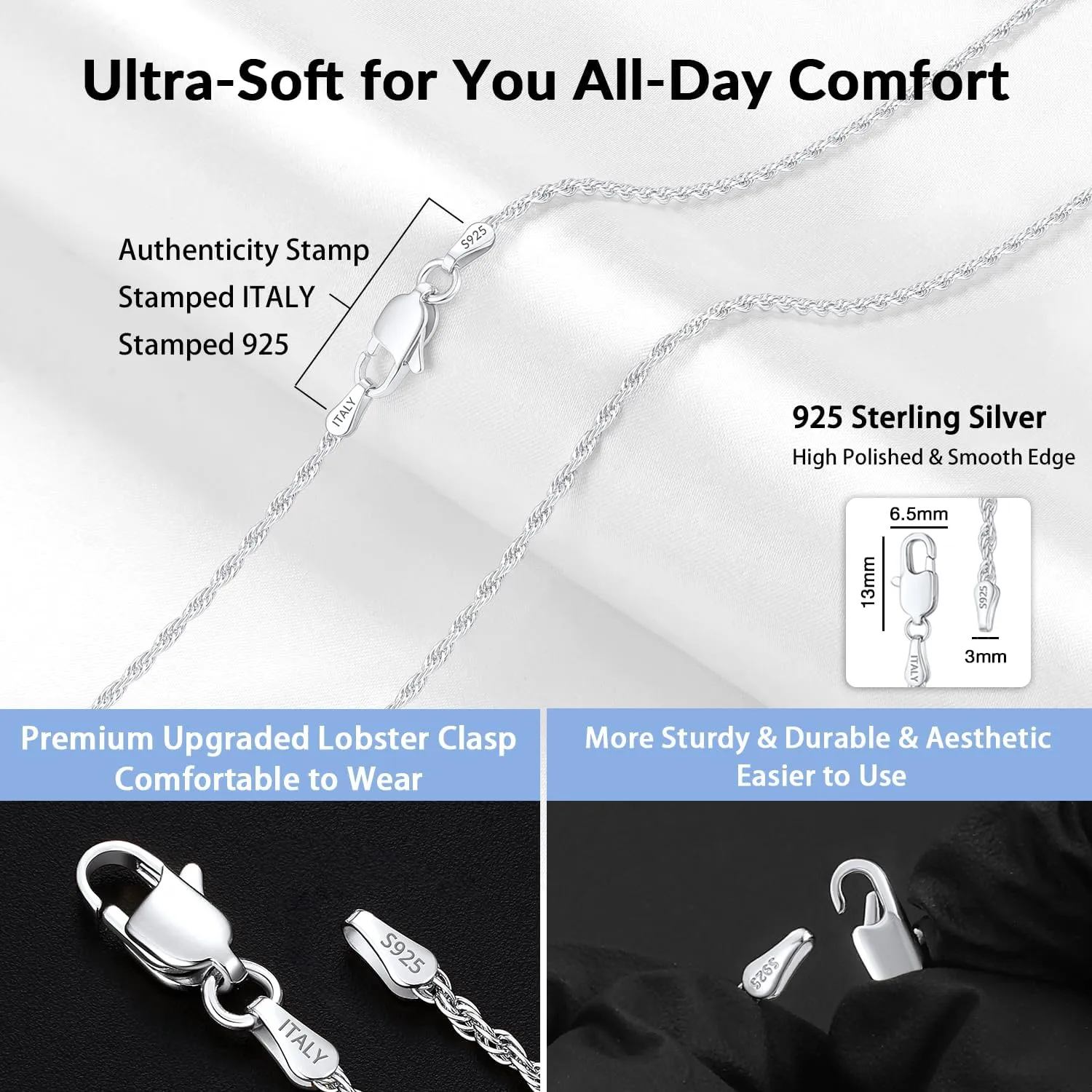 - Perfect Choice To Win SmileAvailable in three precision-crafted widths (1.35mm, 1.5mm, 2mm), simply unlock your perfect chain thickness. This sterling silver necklace can be layered with favorite pendants for personalized flair or wear solo for understated sophistication. The silver chain necklace is packaged beautifully, it would be a perfect and meaningful choice for Christmas, Birthdays, Anniversaries, or any memorable moments.