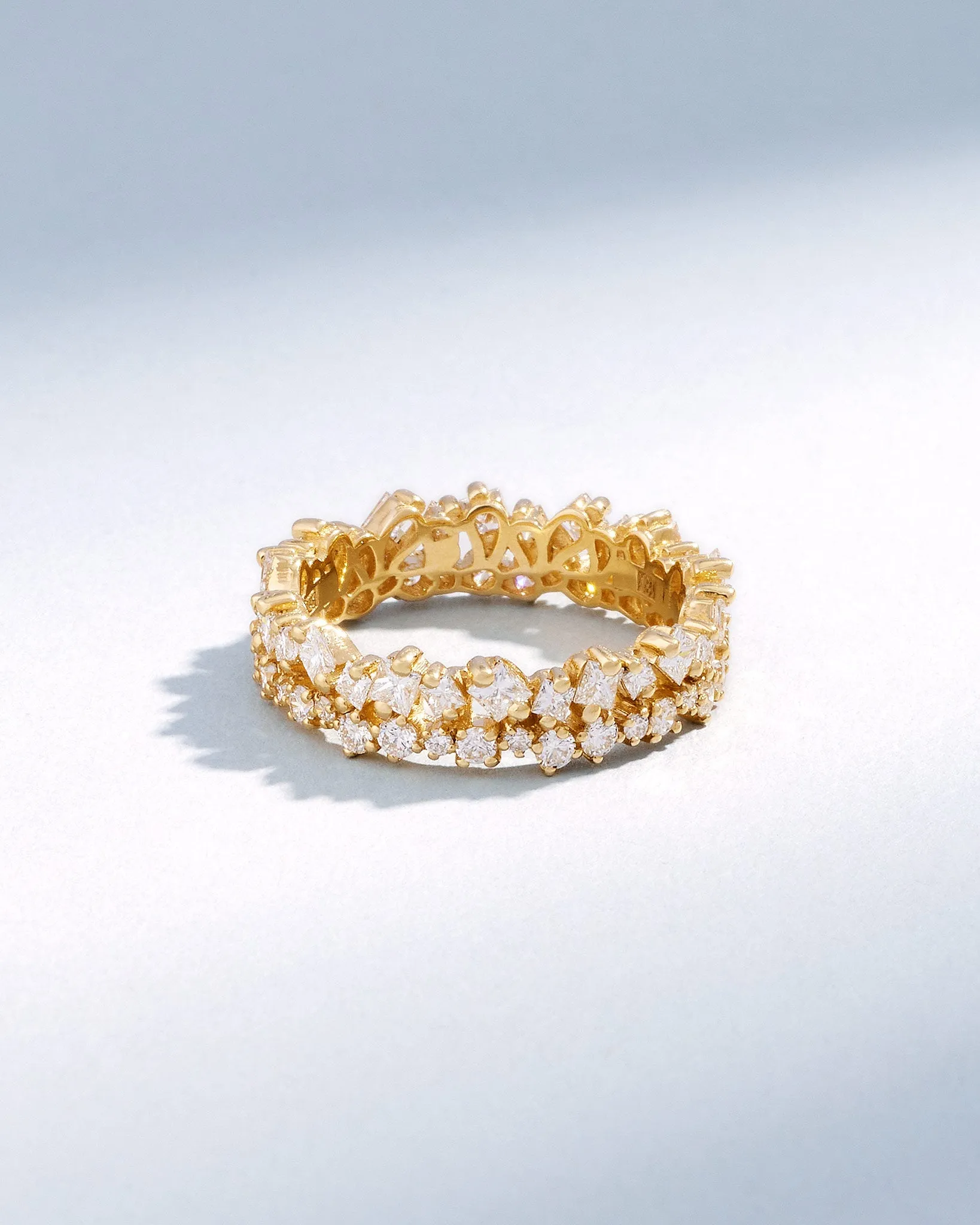 This exquisite eternity band showcases a captivating sequence of princess-cut diamonds, complemented by the subtle radiance of round white diamonds. Set in rich 18-karat gold, the interplay of the diamonds create a stunning visual harmony.