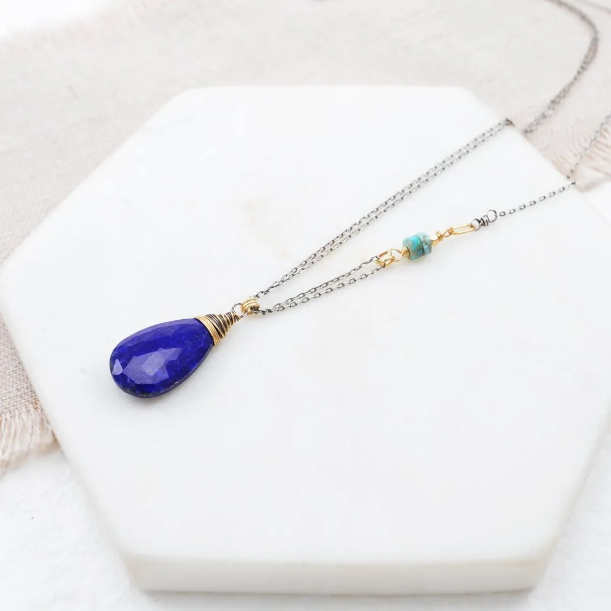 Materials: Lapis teardrop pendant*, turquoise bead, brass nugget, sterling silver chain, gold-fill wire.